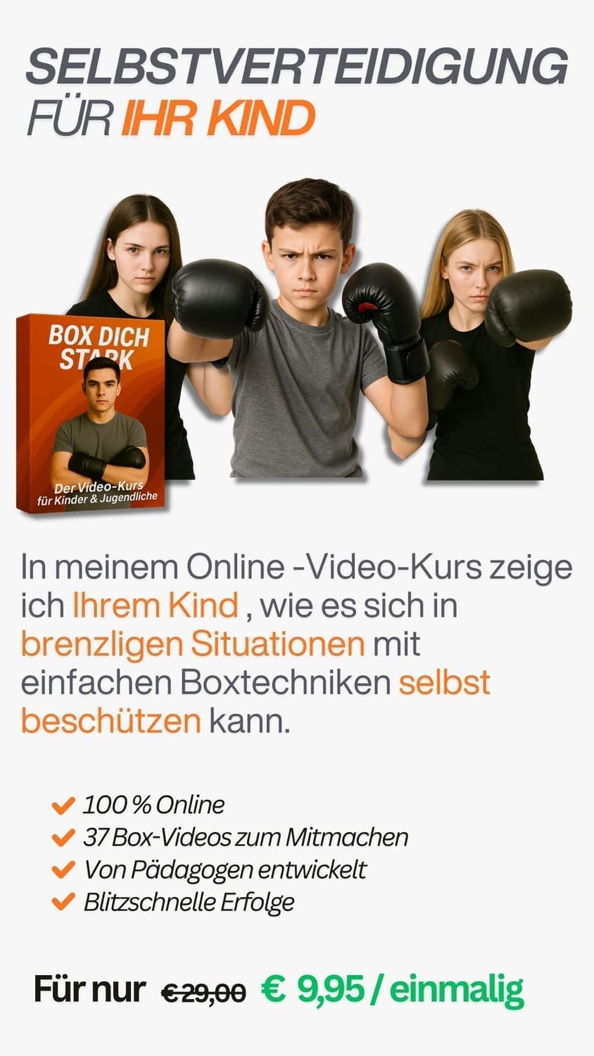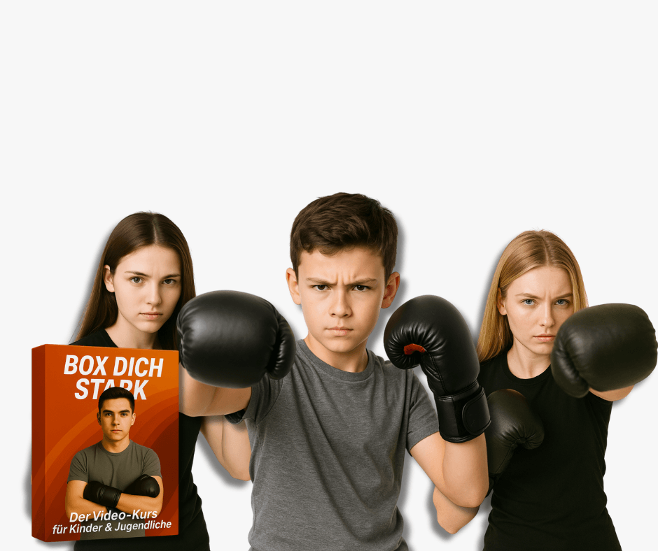 Mit dem Online-Box-Kurs zeige ich Ihrem Kind die Grundlagen des Boxens, damit es sich in Ernstsituationen selbst beschützen kann. Der Online-Kurs enthält 37 Lehrvideos, die Ihr Kind einfach Zuhause nachmachen und üben kann - ohne Ausrüstung oder feste Trainingszeiten.